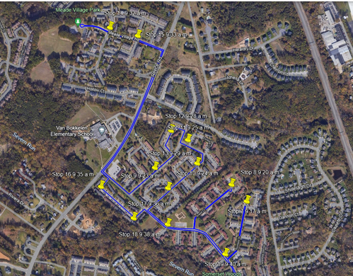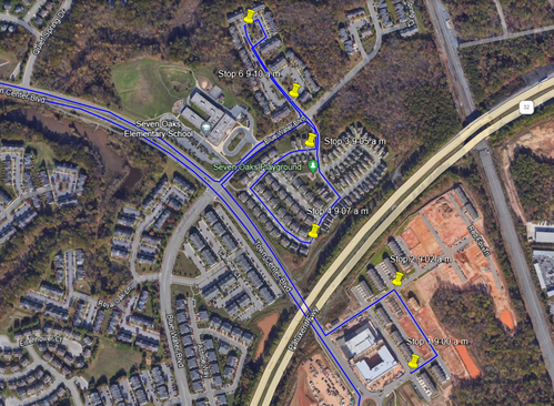 Below are a couple images of where the bus will stop with an approximate time the bus will arrive at the stop. It is always better to be early at the stop so as not to miss it. If you happen to see us driving by you can also flag us down and we will stop if it is safe to do so.